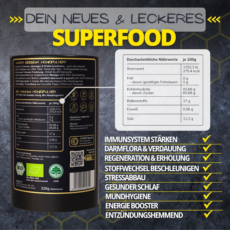 Was du hier siehst, ist kein gewöhnliches Produkt – es ist der Manuka-Moment, neu gedacht. BeeBear Bio Manuka Honigpulver bringt dir die pure Kraft neuseeländischer Manuka-Blüten – in einer Form, wie du sie noch nie erlebt hast: als Pulver. 100 % Natur, 0 % Kleckerei. Praktischer, alltagstauglicher & benutzerfreundlicher als alles Andere.